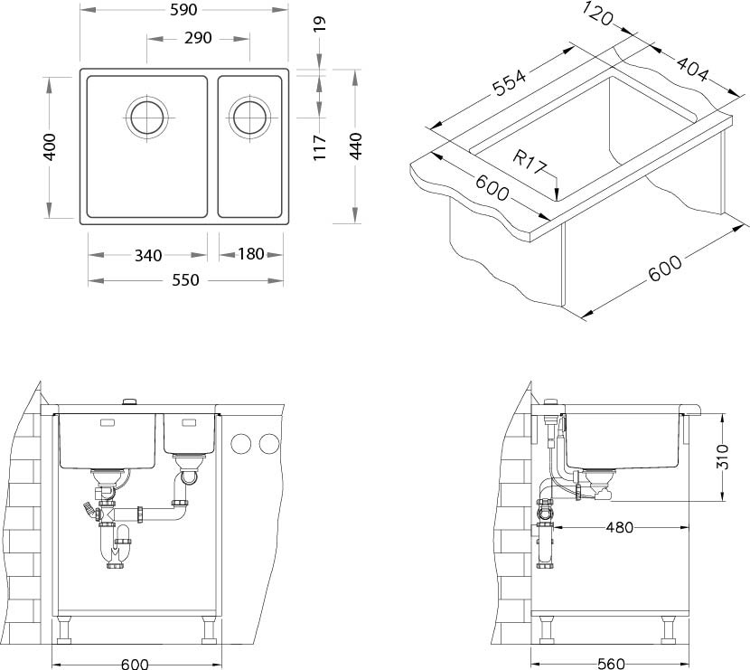 - sifón na úsporu miesta s odbočkou na umývačku.
