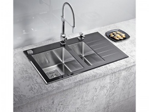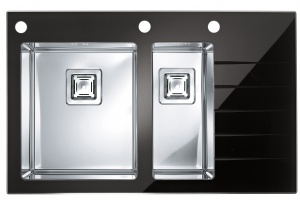 kuchynský sklenený drez s nerez vaničkami - ľavý